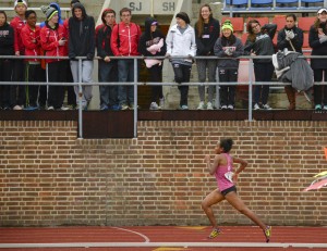 Heritage's Weini Kelati gets the encouragement from fans as she wins the the 3000 meter run during the Penn Relays in Philadelphia, Pennsylvania on Thursday.
