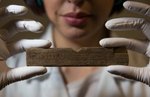 Archaeological conservator Luisa Duarte holds a Roman waxed writing tablet at Bloomberg's London offices on Wednesday. This tablet contains the earliest written reference to London, dated A.D. 65-80; it reads "Londinio Mogontio" -- that is, "in London, to Mogontius.