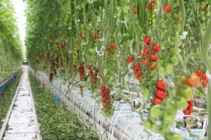 Inside one of Mastronardi Produce Sunset Grown's greenhouses, tomato vines hang on lines that can be adjusted so that the tomatoes are always at a height that's convenient for harvesting.