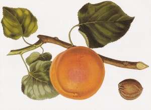 The 'Turkey' apricot, a hand-colored engraving after a drawing by Augusta Innes Withers (1792-1869), from the first volume of John Lindley's Pomological Magazine (1827-1828). The Romans dubbed the apricot the "precious one." Poets praised its beauty. The conquering Arabs took it to the Mideast, where the luxurious fruit was exploited in sugary confections.