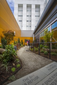 At the VA medical center on Beacon Hill, a new healing garden softens the institutional edges, providing soothing sounds of water and inviting birds into the space to help patients and their loved ones. (Mike Siegel/The Seattle Times)