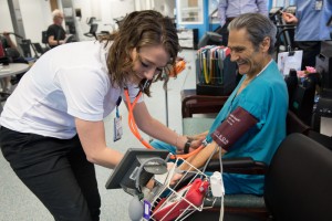 Exercise physiologist Courtney Conners checks Mario Oikonomides' vital signs before his cardiac rehab workout at the University of Virginia Health System clinic.