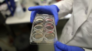 In this file photo, a professor holds a tray of stem cells at the University of Connecticut. The NIH plans to lift a moratorium on funding studies using human stem cells in animal embryos.