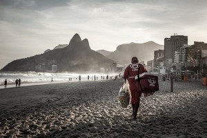 A vendor selling Biscoito Globo and other treats along the beach of Ipanema. Dozens of freelance salesmen show up at Globo’s bakery in Rio de Janeiro daily, buying a sack with 50 bags for the equivalent of about $15 and selling it at double or triple the price