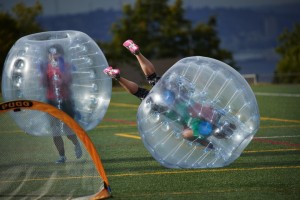 Jenny Gawf experiences the ups and downs of bubble soccer during a two-on-two game. (Benjamin Benschneider/The Seattle Times)