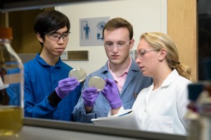 Christian Choe, Zach Rosenthal, and Maria Filsinger Interrante, who call themselves Team Lyseia, strategize about experiments to test their new antibiotics.