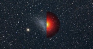 The Small Magellanic Cloud (SMC), at center, is the second-largest satellite galaxy orbiting our own. This image superimposes a photograph of the SMC with one half of a model of its dark matter (right of center). Lighter colors indicate greater density and show a strong concentration toward the galaxy's center. Ninety-five percent of the dark matter is contained within a circle tracing the outer edge of the model shown. In six years of data, Fermi finds no indication of gamma rays from the SMC's dark matter.