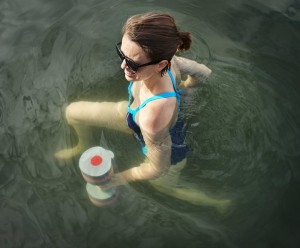 Using buoyant barbells, Bailey Hinckley practices water jogging in Green Lake.
