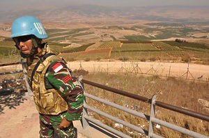 An Indonesian peacekeeper serving with UNIFIL stands watch on Lebanon's southern border with Israel near the village of Kfar Kila Aug. 19, 2016. Behind him are the orchards of the northern Galilee, with the Golan Heights in the distance.
