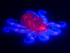 A pneumatic network, in red, is embedded within the octobot's entirely soft body and elastic arms, in blue.