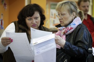 Women read their ballots at a polling station during parliamentary elections in St. Petersburg, Russia, Sunday, Sept. 18, 2016. Russia's governing party and its three largely cooperative opponents are expected to retain their positions in the national parliament, but new procedures for choosing the seats could affect their proportions.