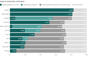 *”Early in person” totals include “no excuse” in-person absentee voting. Iowa, Maine and Wisconsin also offer “no excuse” in-person absentee voting, but figures were reported with all absentee voting.