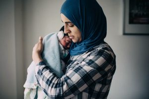 Salma Shabaik holds her newborn son, Ali. When he was born, she held him naked against her bare skin, a practice called kangaroo care. Ali is wearing an ear cap to correct a lop ear.