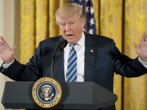 President Donald Trump speaks during a White House senior staff swearing in ceremony at the White House on Sunday