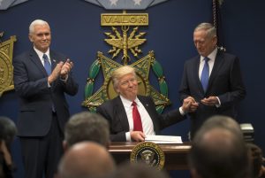 President Trump and Vice President Mike Pence, left, at the Pentagon with Defense Secretary James Mattis, right, Friday. Experts say Trump’s ban on certain refugee visas is unlikely to reduce the terrorist threat.