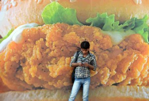 An Indian pedestrian checks his mobile phone in front of an advertisement for a burger of a fast-food giant in Mumbai, India. Fast food and highly processed foods and sodas are increasingly becoming more popular around the world, one of the main reasons for increasing rates of overweight and obesity.