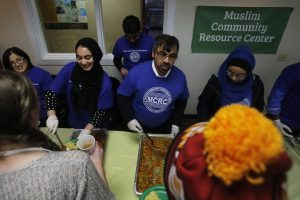 Co-founder of the Muslim Community Resource Center Khizer Sheriff (center) hands out a spoonful of chicken and vegetables at a Seattle-area community center on Friday. About 40 volunteers of various faiths served Christmas meals to almost 120 people in need. This marks the fourth year that the Muslim Community Resource Center at Muslim Association of Puget Sound has partnered with the Holiday Cheer & Winter Response community to serve holiday meals to the less fortunate.